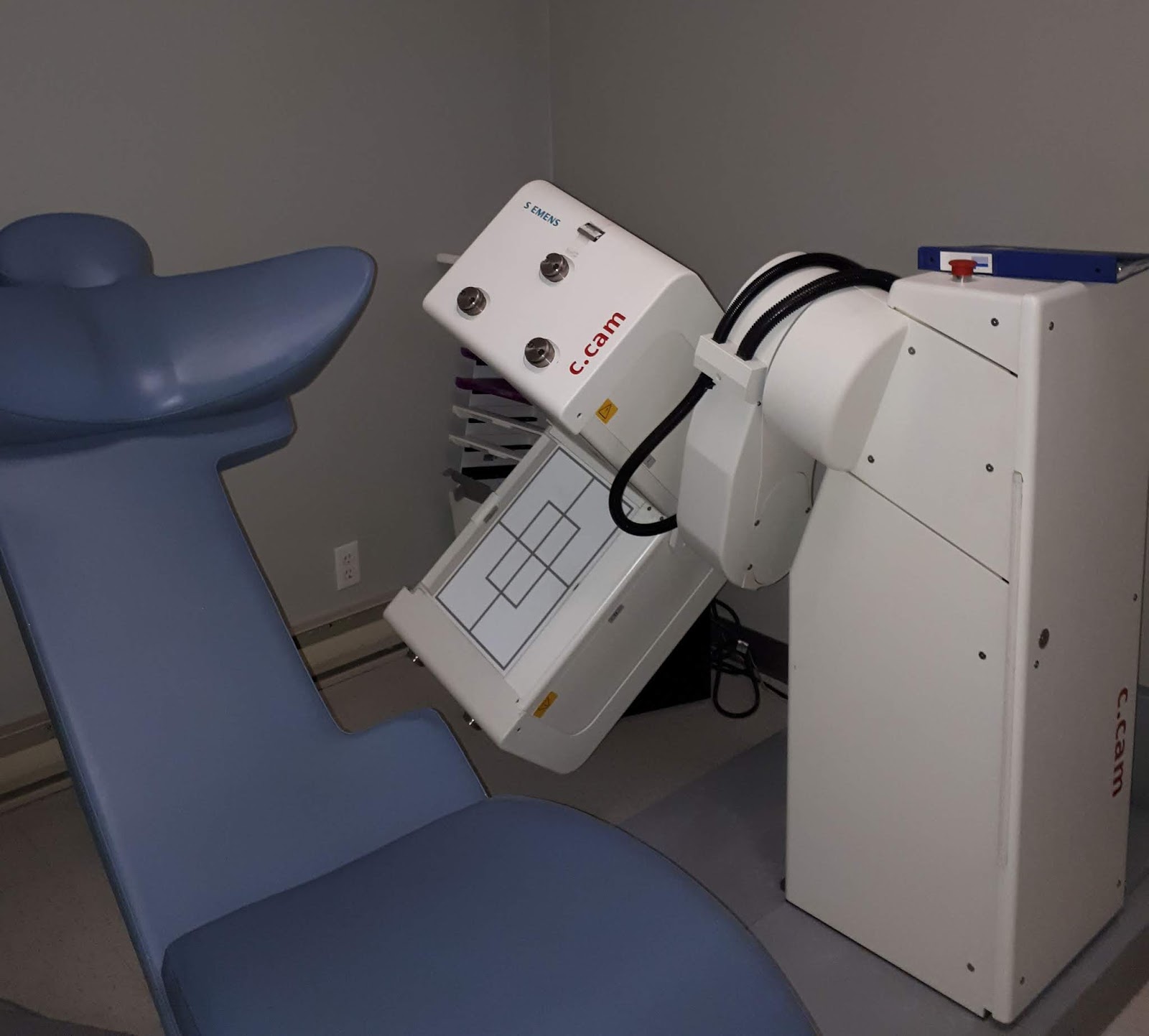 • 1015 Called in for start of the “not exercising” part of the test. They put a couple of electrodes on my chest and abdomen, and put me in the scanner (shown above) for about 15 minutes. The scanner is a camera that takes images of the radioactive dye that spread into the blood vessels of my heart. Setup and finishing took it all to 1050.