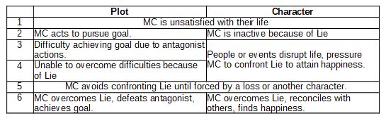 Step 5 includes the black “all is lost” moment that is part of several plot structures; overcoming the Lie involves accepting the Truth. From the MICE perspective both are character threads; perhaps the Character column merely means stories where the outermost thread is Character, and the nested one(s) are of other kinds.